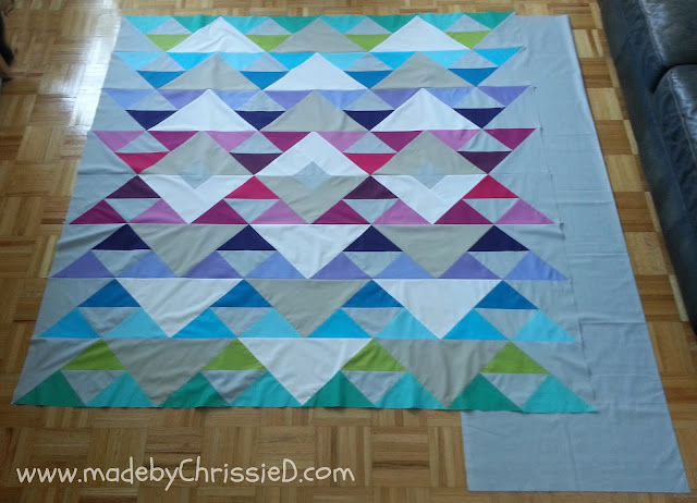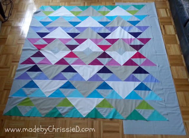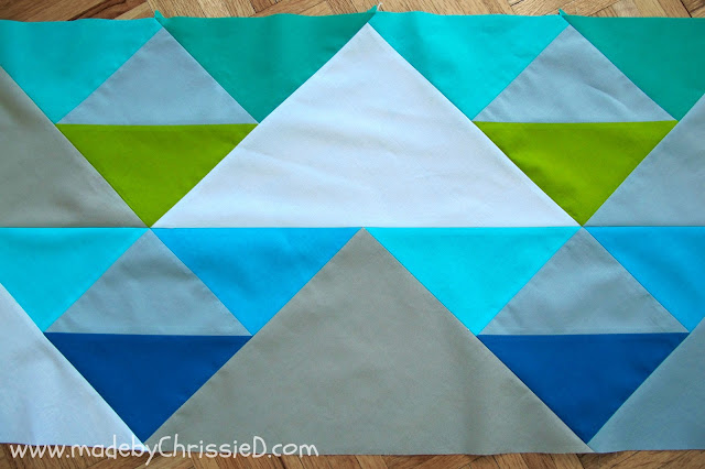 I found the Log Cabin Triangles were slightly large - but I trimmed down the straight triangle edges (NOT the diagonal) to 12" and found the two centre rows pieced more easily. Please attempt to use the triangles at full size before trimming just in case the original untrimmed size works well for you but I'm including my trimming note here to document for others the possible need for trimming.
