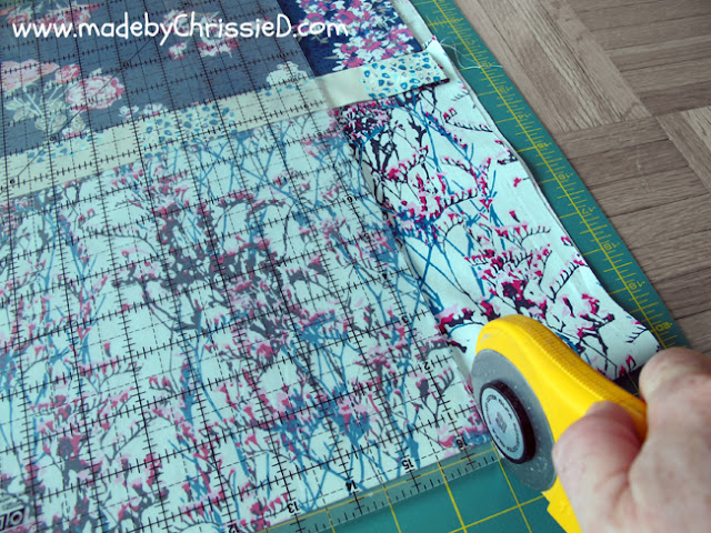 Lining the accent fabric up with a line on your ruler, as in pic below, can help give you a clean 90-degree angle to keep the pillows correctly squared and straight.