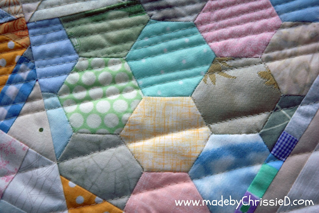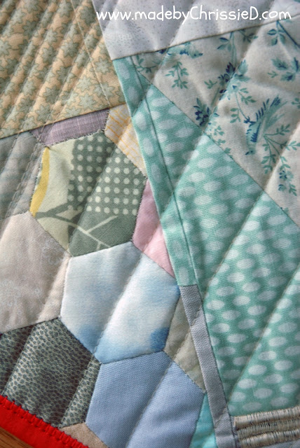 The quilting's freehand straight line at varying intervals and this is a close up of one of my favourite parts of the quilt - handsewn hexies, when I was cutting down my blocks I did make sure I kept these in pretty good shape/large pieces for the finished quilt top
