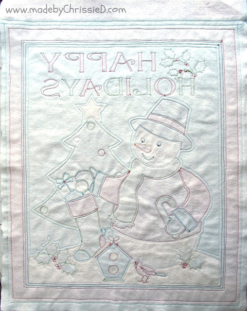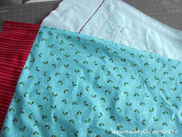 Using threads of your choice machine, free motion or hand quilt both of your panels.  You can add other embellishments, buttons, ribbons, bells, etc, go mad!  You might want to applique or use fabric paint or pens to add a name, year or special message.