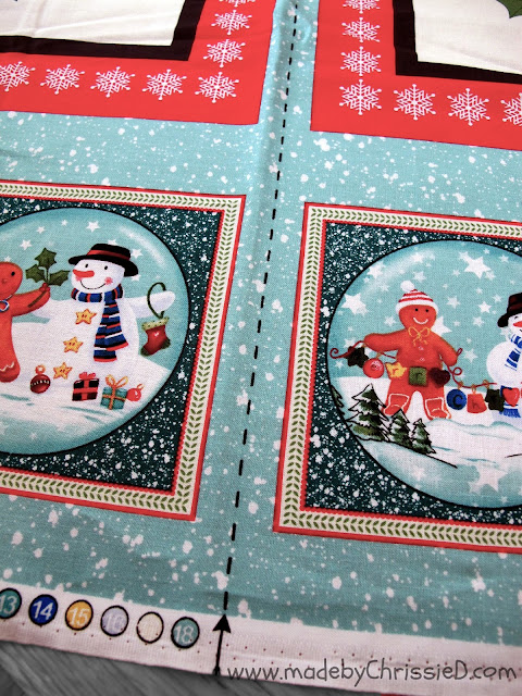 There's sometimes a dividing line indicated between panels - if not create your own line half way between the two-panel designs.  Open fabric out fully to cut and separate.  This panel has a cut line marked for us.