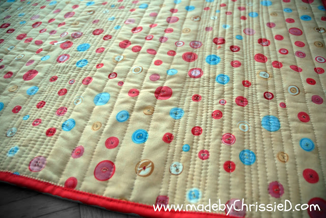 On the back, I used a bright button fabric that has lots of the same colours in it that are in the blocks on the front -