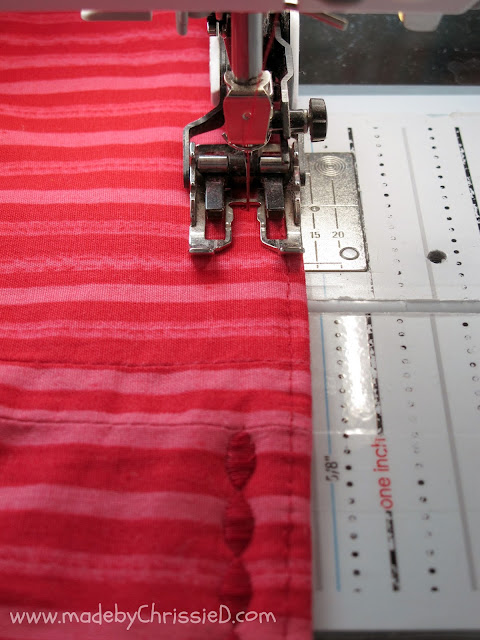 TIP: As we're using three different fabrics for this project if you water spray/steam your fabrics when pressing it's best to water spray and press the fabric before cutting to avoid later piecing problems caused by possible shrinkage.  Ask me how I know - the panels didn't shrink but the red stripe did and I had to sew an extra piece to each of four borders!!!